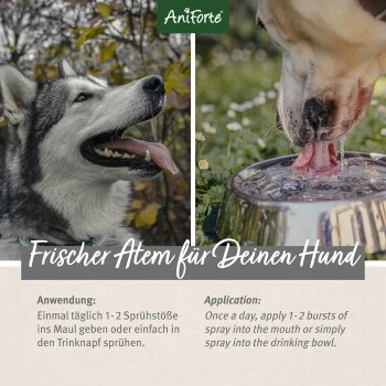 Da wir natürliche Inhaltsstoffe aus Pflanzenextrakten nutzen, eignet sich das Dentalspray für Hunde, die nicht alles vertragen. Das AniForte Denta Clean & Care Dentalspray ist die flüssige Zahnbürste für Hunde – noch nie war Mundhygiene einfacher! Einmal täglich 1 – 2 Sprühstöße ins Maul oder ins Trinkwasser geben.